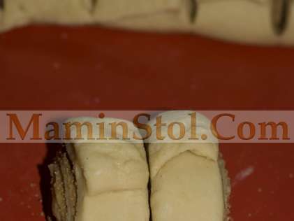 8. Выкладываем начинку на широкий край получившихся треугольников.
